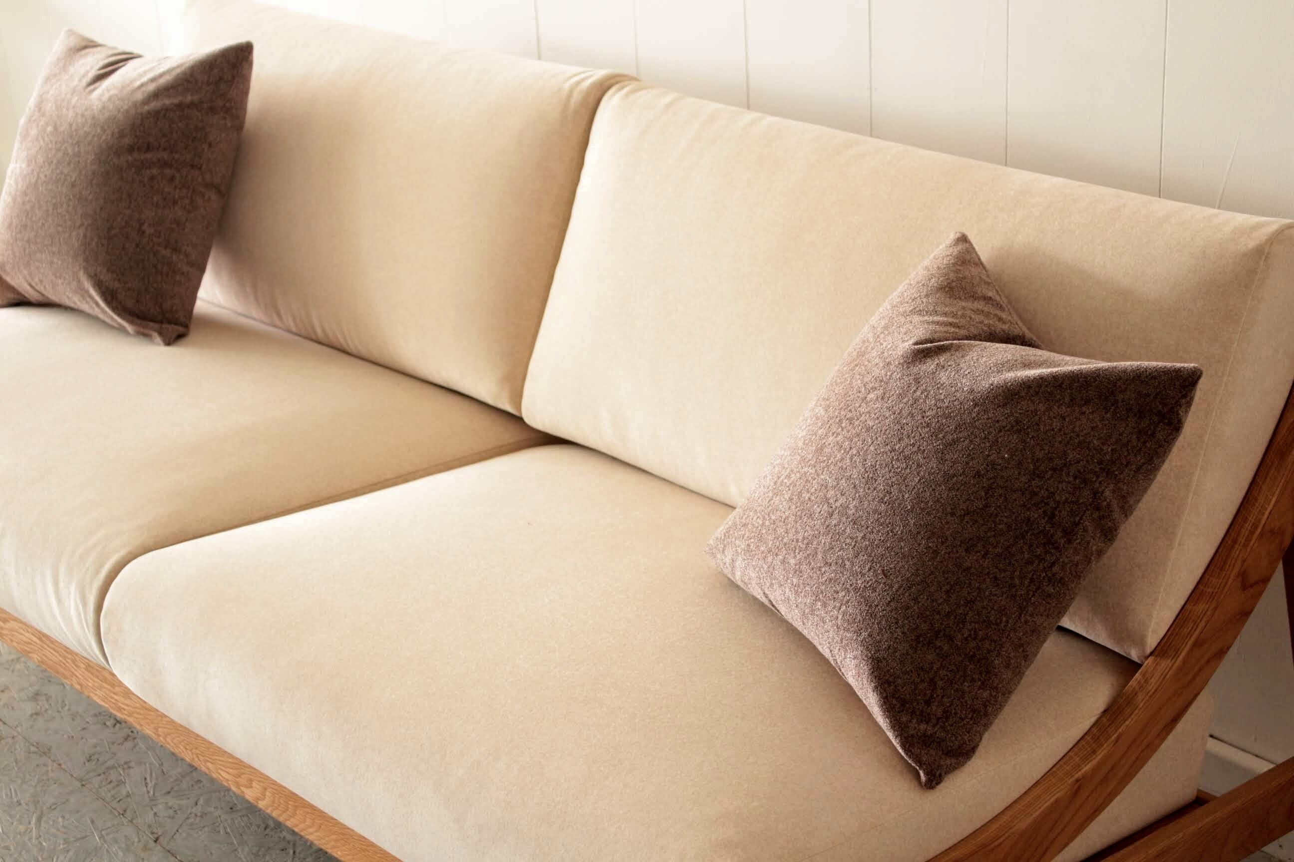 背のクッションは形を保ちながらも柔らかく、座面はやや硬めで疲れにくい構造です。 また、クッションを外して広々と出来ます。後ろ姿も美しく、リビングの中央付近に配置しても映えます。