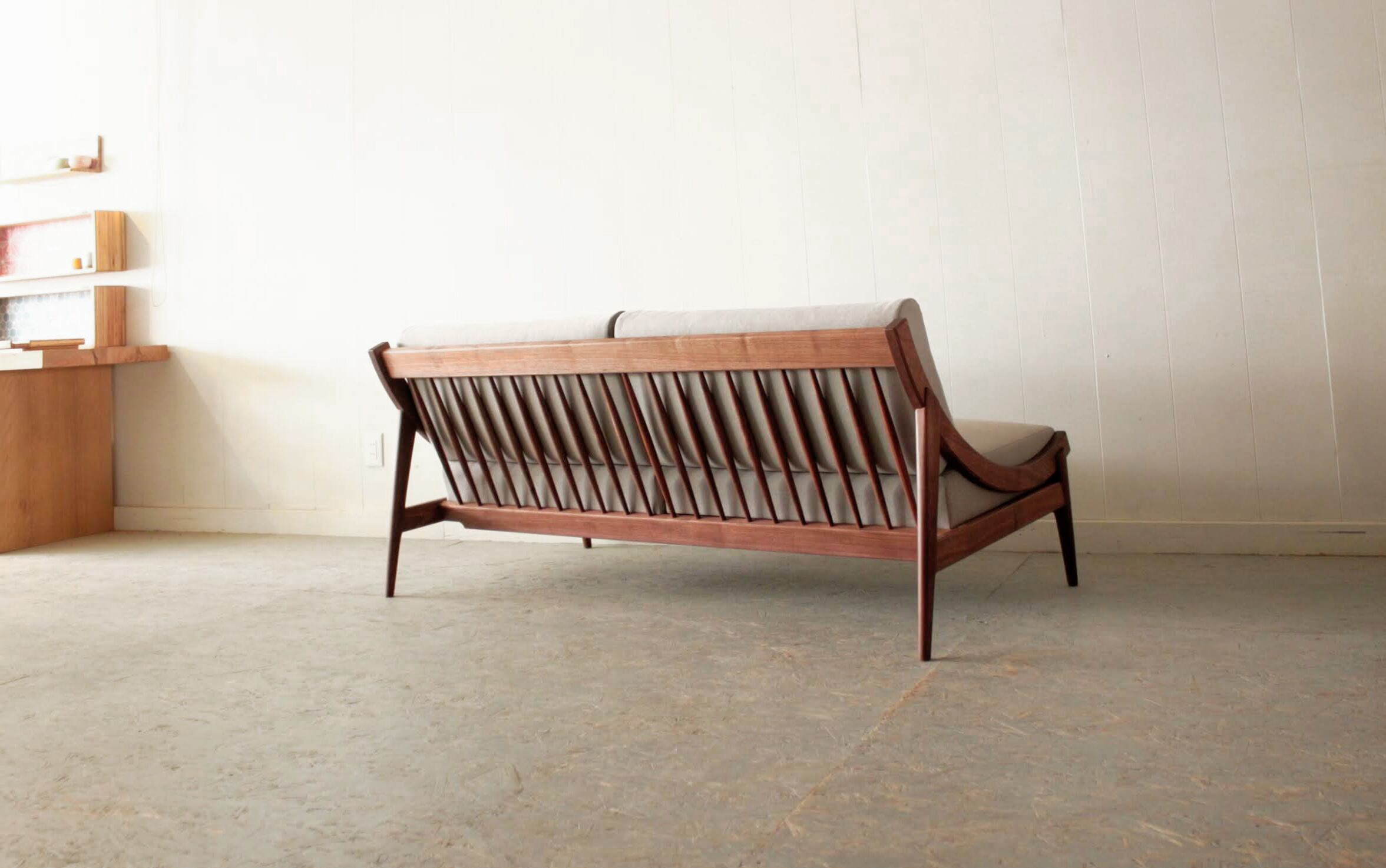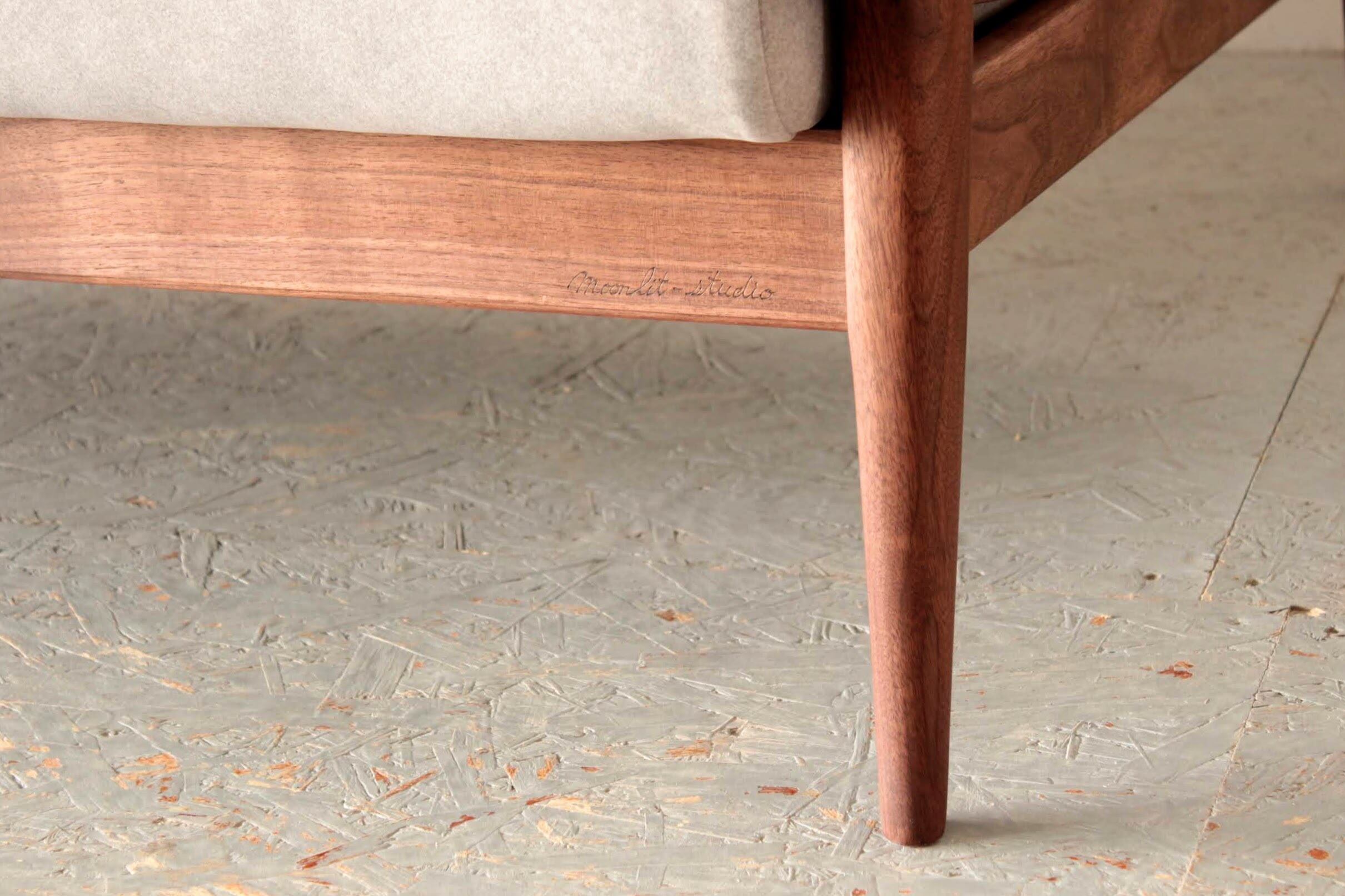 背のクッションは形を保ちながらも柔らかく、座面はやや硬めで疲れにくい構造です。 また、クッションを外して広々と出来ます。後ろ姿も美しく、リビングの中央付近に配置しても映えます。