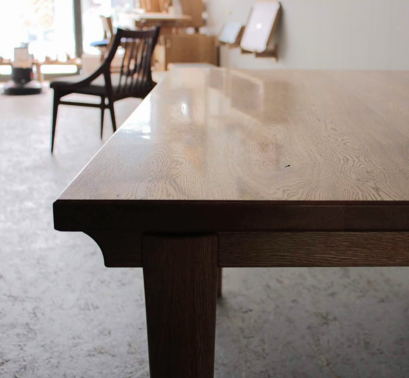 このシリーズは部材全体に「片銀杏面」という加工を縁取るように施すことで、パーツのラインを強調し、同時にクラシカルさを演出しています。 天板はカンナ仕上げによるもので独特の質感、無垢の風合いをいつまでも感じられます。天板裏も品良く強度を出しています。