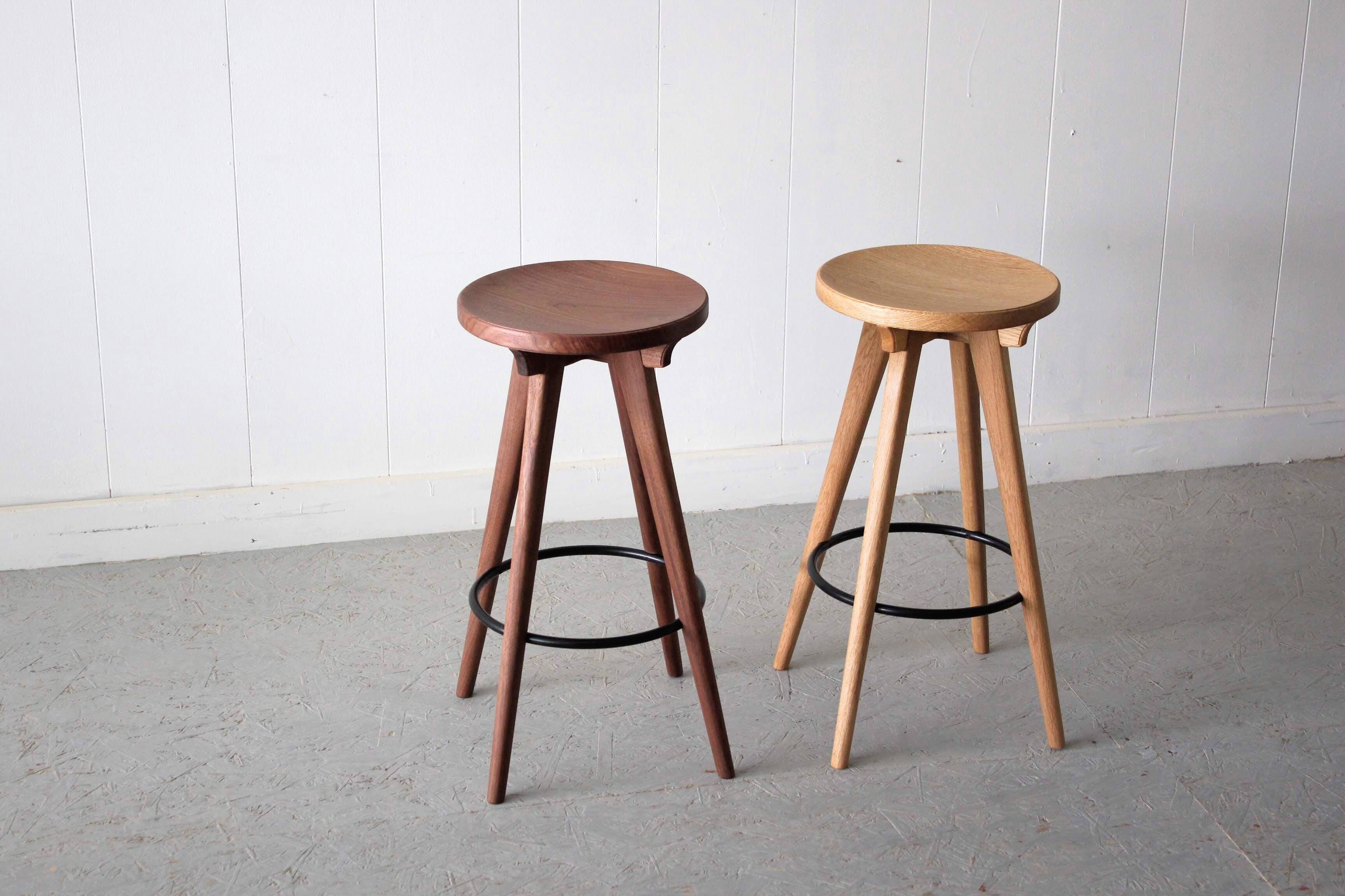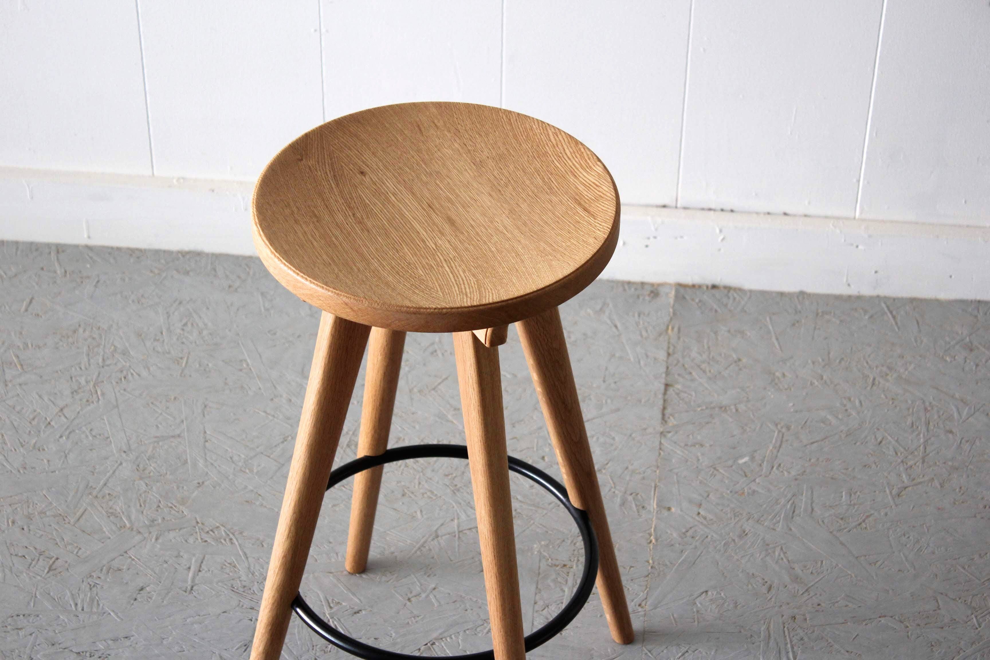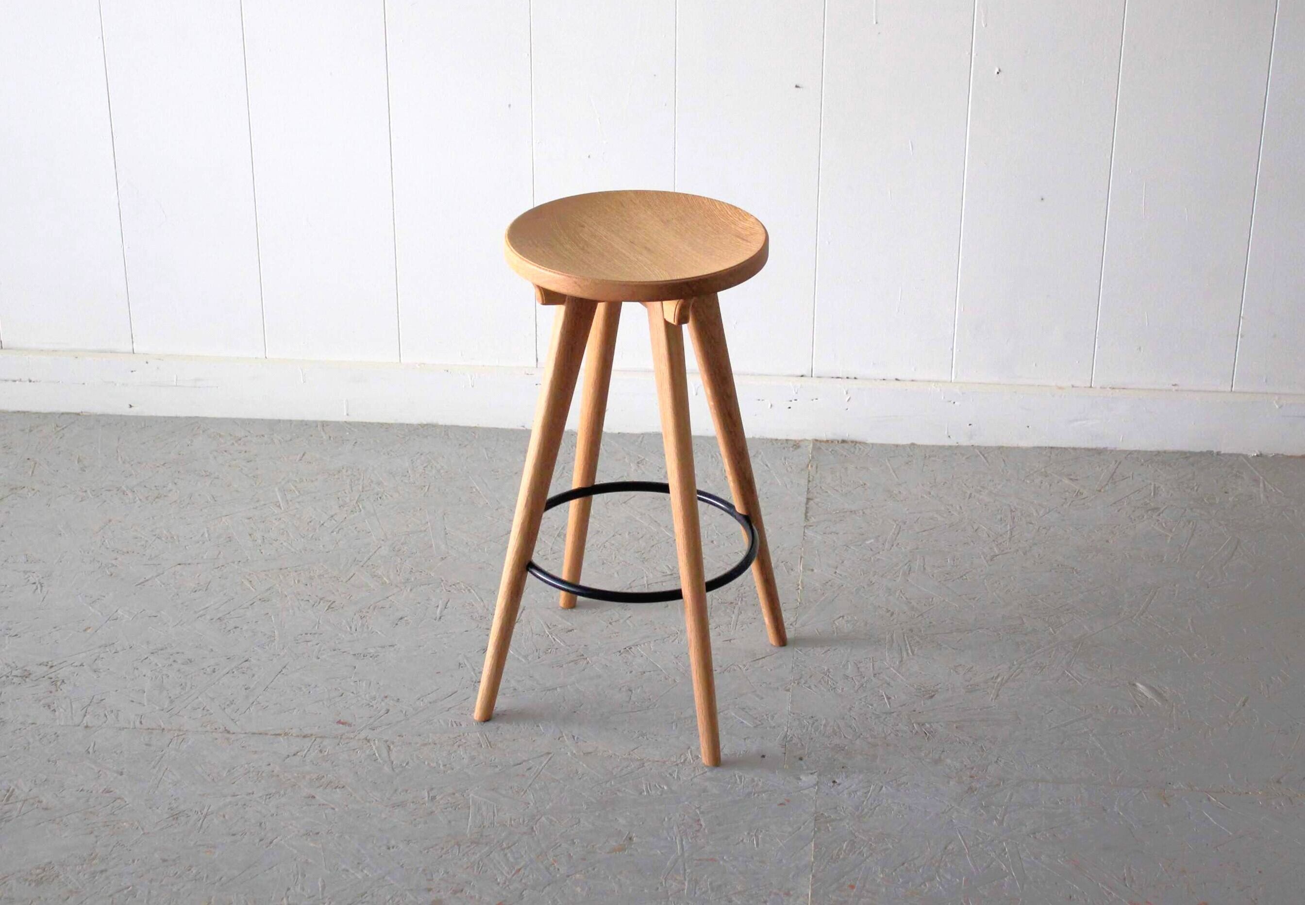 脚の強度を出す為の接合部の加工他、手仕事の要素がたくさんの作り込んだ製品です。 丸い足掛けの部分はアイアン(鉄製)で、気兼ねなく掛けれます。