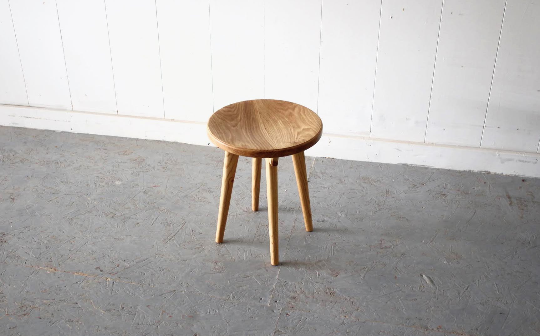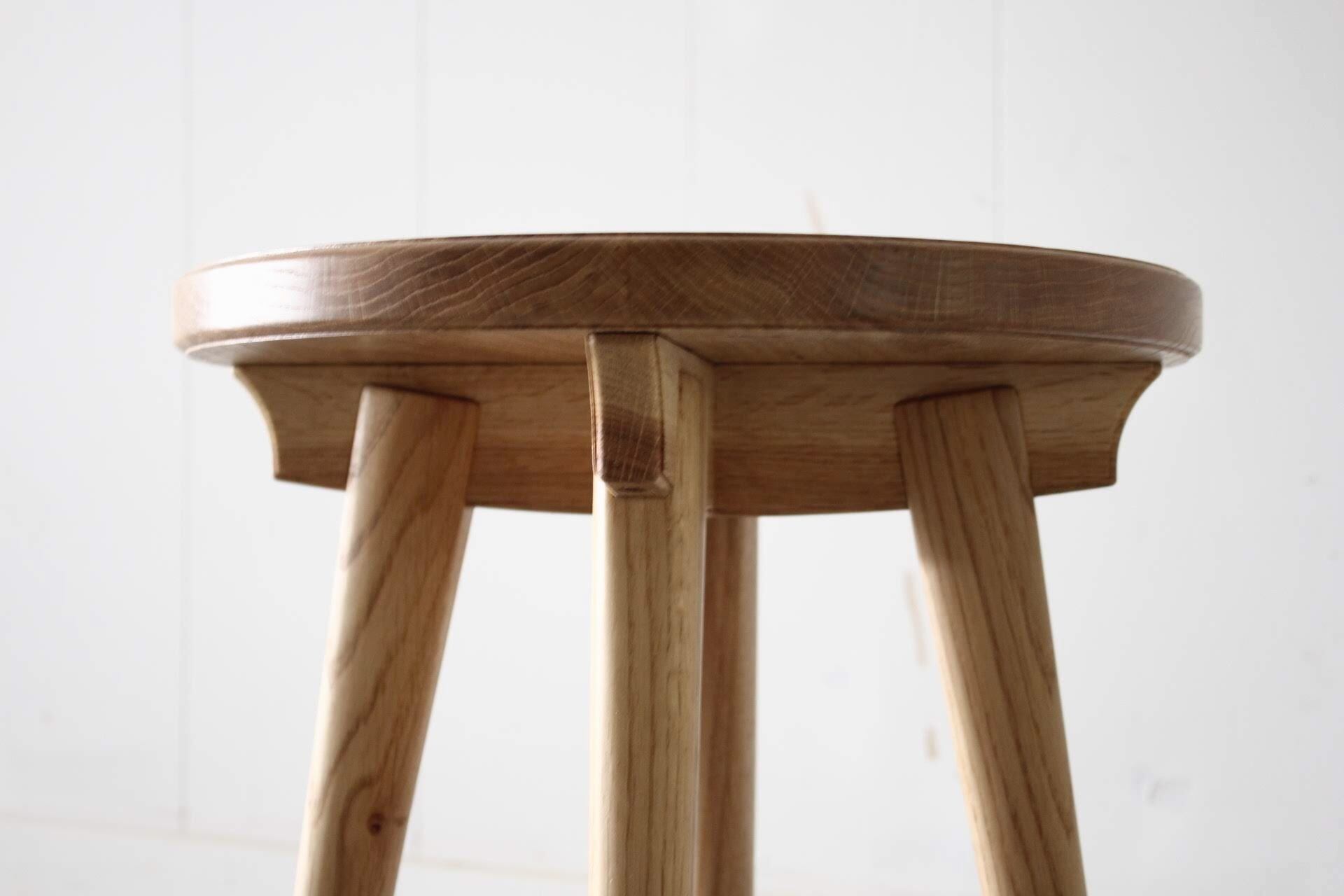 丸く窪んだ座面の掘り込みがやさしい座り心地のスツール。 脚の強度を出す為の接合部の加工他、手仕事の要素がたくさんの作り込んだ製品です。